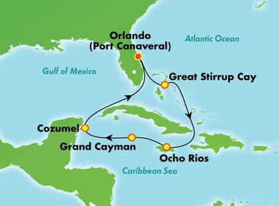 Leaving out of Cape Canaveral, Florida. Stops include the Bahamas, Jamaica, Grand Cayman & Cozumel.